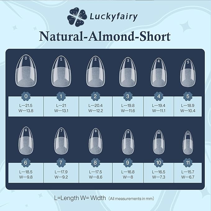 • ❤️12 Sizes to Fit Your Nails: 12 Sizes to Fit Your Nails: Luckyfairy short almond tips come in 12 sizes, each marked with a size number for easy selection. We also include 2 extra sizes(No.0 and No.11) to ensure a perfect fit for large or small nails, providing a customized manicure experience.