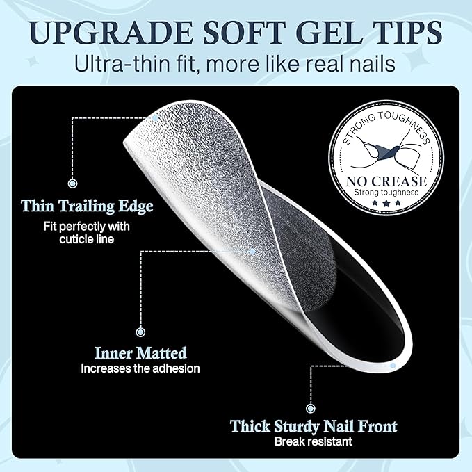 • ❤️Wide Application: Luckyfairy Soft Gel Tips can be used for gel nail polish, acrylic nails, dip powder nails, poly nail extension gel, nail decorations, etc. Suitable for both DIY at home and professional nail salons.
