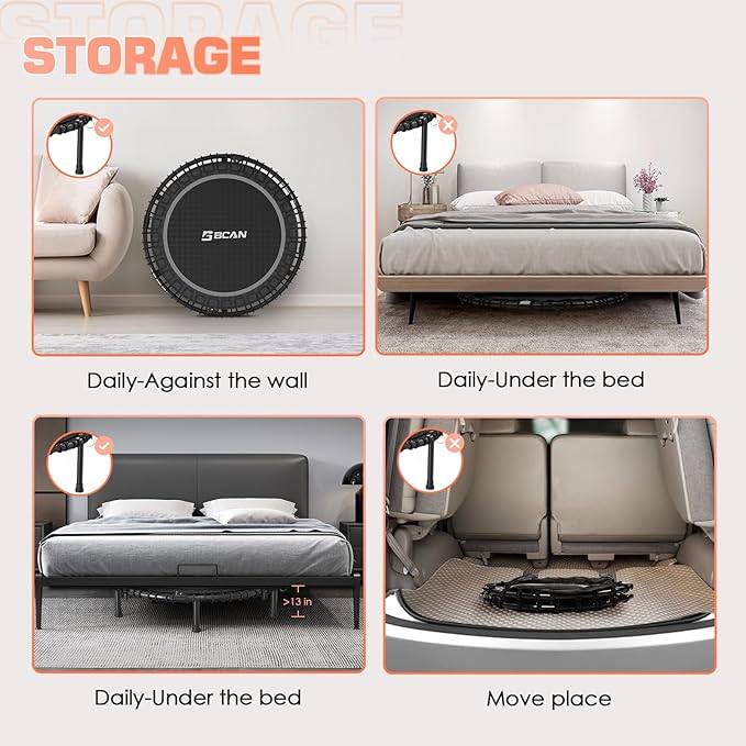 • High-Quality Bungee: BCAN trampoline uses high-quality synthetic bungee, can buffer nearly 85% of the vibrations, provide more sustained and softer elasticity, and protect Knees, Back and Joints, a great choice for health, aerobic exercise, relax