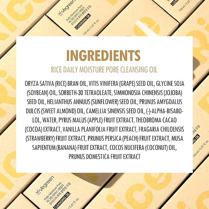 • GENTLE CLEANSING ELIXIR. VEGREEN Rice Daily Moisture Pore Cleansing Oil is a lightweight face cleansing oil that harnesses the power of Rice Bran, Grape Seed, and Jojoba Oils to dissolve makeup and impurities. Its delicate watery consistency ensures a deep cleanse without leaving any residue.