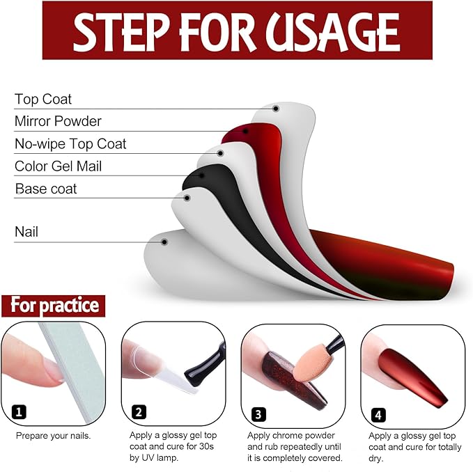 • 【PACKAGE CONTENTS】:16 pcs(each 1gram) Artdone Chrome Nail Powder, 6 for white based chrome nail mirror pigment powders, 7 for mirror chrome powder, 3 for holographic nail powder. They needs to be used with gel nail polish and no wipe top coat.