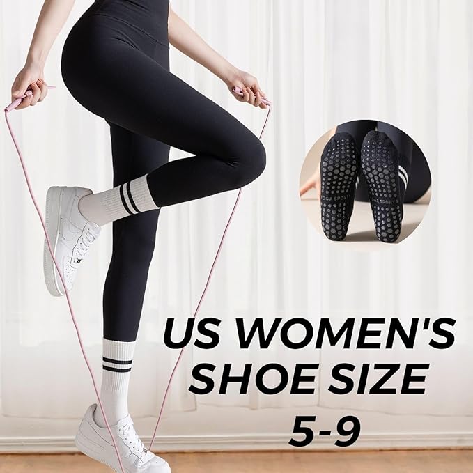 • 【NON SKID SOLES】:The small PVC particles on the bottom of women's grip socks largely increase factions between feet, socks and the floor. The trampoline grip socks are designed for falling prevention, with grippers covering heel to toe.Our grip socks provide optimal traction, stability and comfort to ensure your feet stay secure on mats or equipment. Say goodbye to slipping and sliding - keep your foundation safe. Fitness and workouts are equally secure with grip socks.