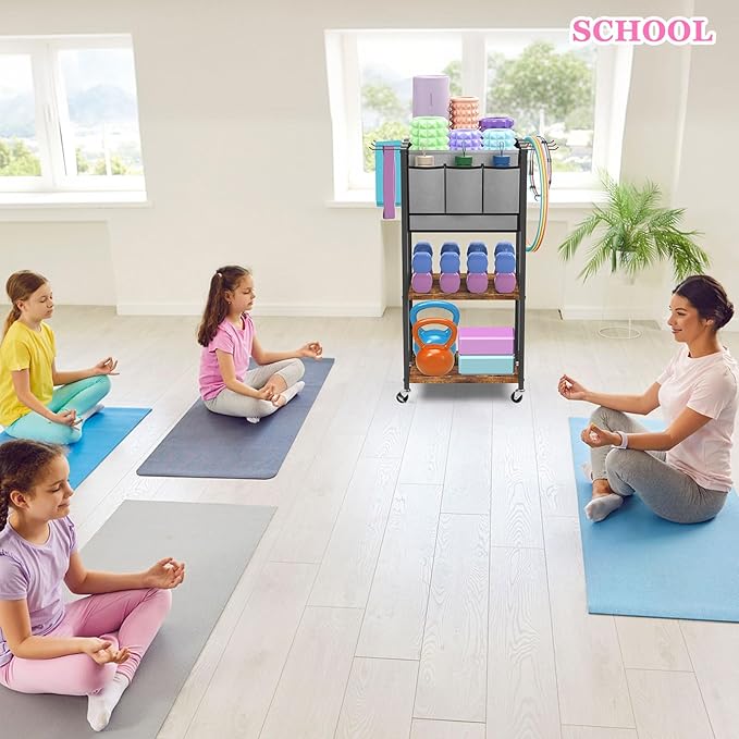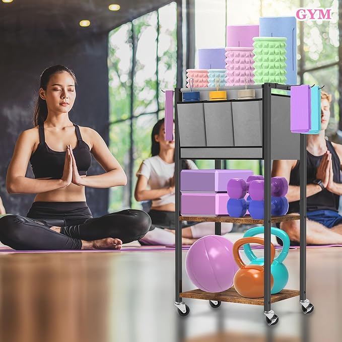 Yoga Mat Storage Rack Home Gym Equipment Yoga Mat Holder for Yoga Mat Dumbbells Kettlebells Foam Roller Yoga Strap Workout Equipment Storage Organizer with Hooks Wheels, Rustic Brown