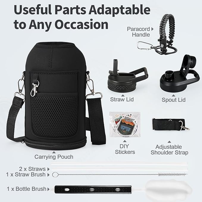 • After Services and Package: We offer continuous after-sales service against leakage and poor cold/hot-keeping capability, we are committed to 100% customer satisfaction. Your purchase includes: WixByti 64oz Water Bottle, Carrying Pouch with Adjustable Strap, Straw Lid with 2 Straws & 1 Straw Brush, Spout Lid, Paracord Handle, Water Bottle Stickers