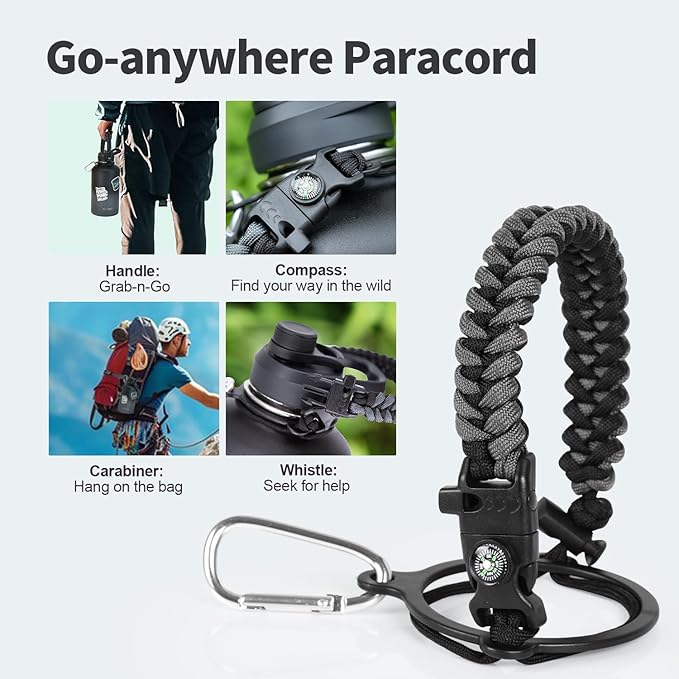 • Palm Fitting Paracord Handle: Compared to handle lids, nylon paracord on the bottle gives you more choices in terms of color coordination and coziness on your hands. Match the handle with your bottle to make a complete outdoorsy look. Compass and carabiner can be lifesavers for hiking and other expeditions