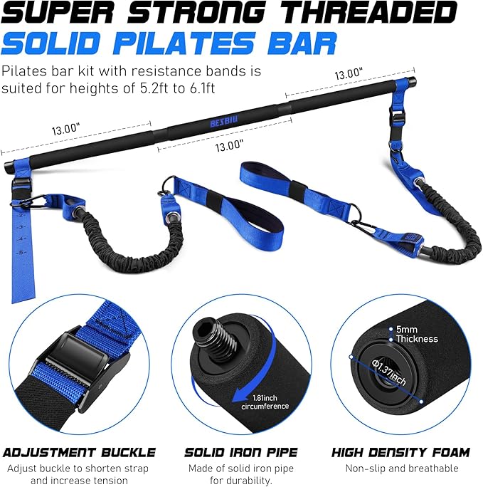 • ADVANCED THREADED PILATES BAR: Composed of 3 sections Φ1.37-inch solid steel rods, with 5mm Soft Nitrile Rubber pad (wear-resistant, sweat-absorbent, non-slip), and can perform stable and safe exercises even if sweat during exercise. Squat bar ends are equipped with adjustable straps with a heavy metal buckle cam that allows you to quickly and easily adjust the length required for various exercises and individual heights. This strong screwed solid squat bar can withstand 600lbs of resistance