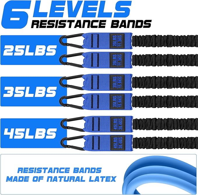 • 210LBS HEAVY RESISTANCE BANDS: 6 exercise bands, 2x25lb, 2x35lb, 2x45lb tubes, enabling up to 210lb resistance. Each resistance band is encased in a durable nylon sleeve, for maximum longevity and safety during use. Natural latex material with high elasticity and tear resistance, which can withstand intense daily exercise. Whether beginner or advanced, these exercise bands adapt to your strength level. Our pilates bar kit with resistance bands is suited for heights of 5.25' to 6.25'
