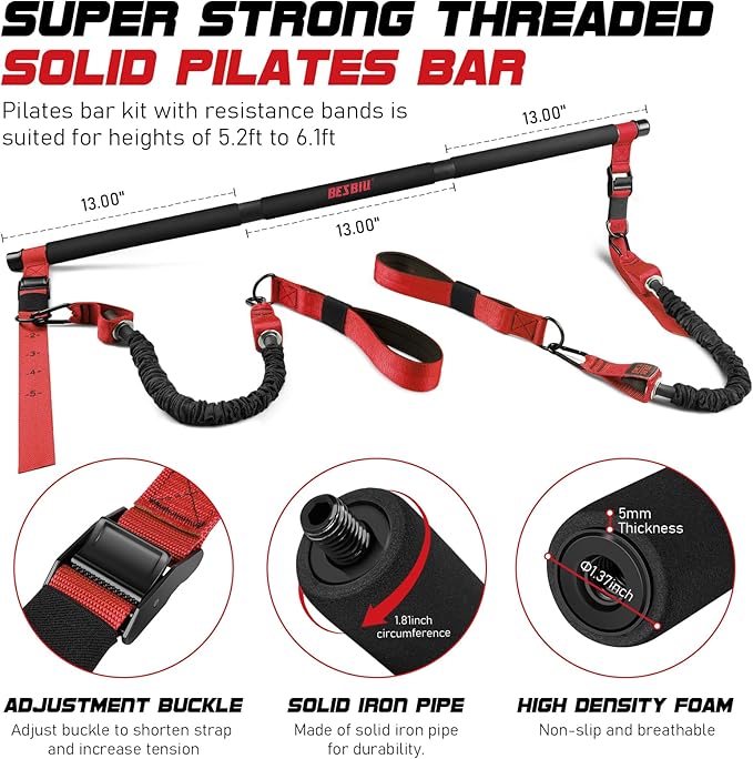 • Included Components : Anti-slip soft pad handles, Soft SBR material padded foot straps, Thicked door anchor, Adjustable padded ankle straps, Pilates bar workout poster, Warning card, Carry bag, Gift box Anti-slip soft pad handles, Soft SBR material padded foot straps, Thicked door anchor, Adjustable padded ankle straps, Pilates bar wor… See more