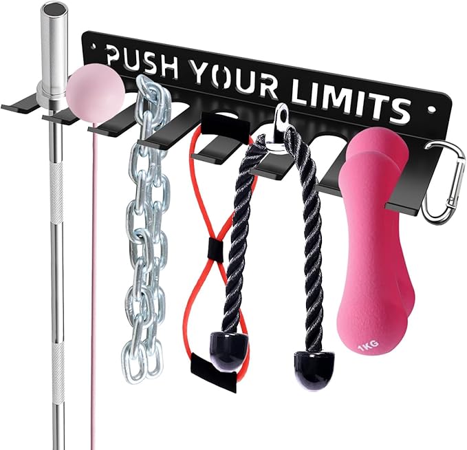 • Multi-Purpose Design: Our heavy-duty storage rack is designed to hold a variety of fitness equipment such as resistance bands, straps, jump ropes, foam rollers, chains, barbells, weight belts, and various tools. It helps to keep your workout essentials organized and easily accessible in one place. The enhanced barbell holder comes with 2 carabiners to expand storage for hangable gym equipment.