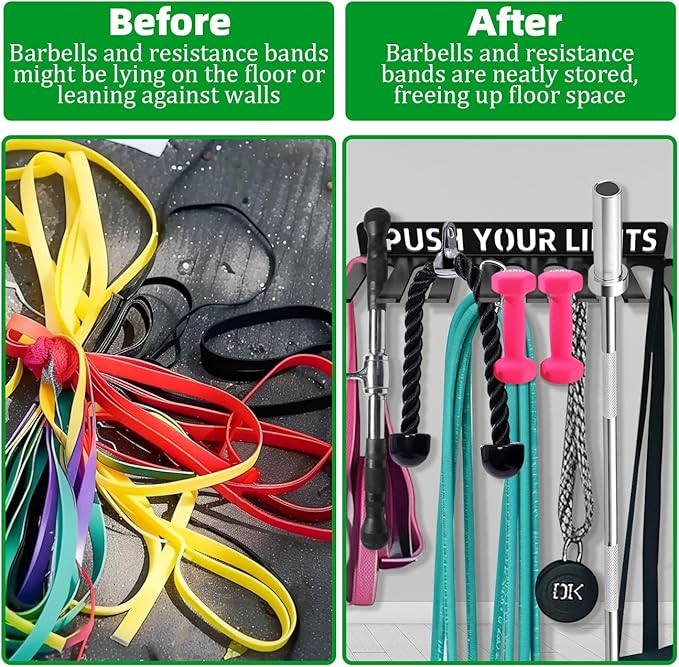 • Easy Access and Organization: Our resistance bands rack provides a practical way to keep your workout accessories neatly organized with multiple hooks and compartments. You can hang your resistance bands, straps, and jump ropes on the hooks, while the spacious compartments can store foam rollers, chains, weight belts, and other tools. This helps you stay organized and saves time searching for your gear during workouts.