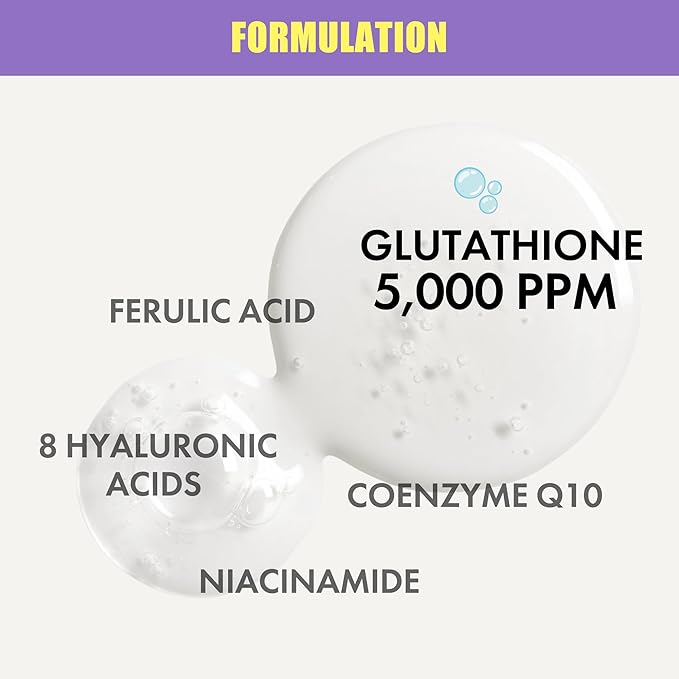 • [5000ppm Glutathione + Vitamin C for Radiance] Glutathione is a powerful antioxidant that targets dark spots at the source — helping to prevent new spots and fade existing discoloration. Paired with Vitamin C, it enhances brightness and boosts overall skin clarity. Perfect for restoring a smooth, even-toned glow.