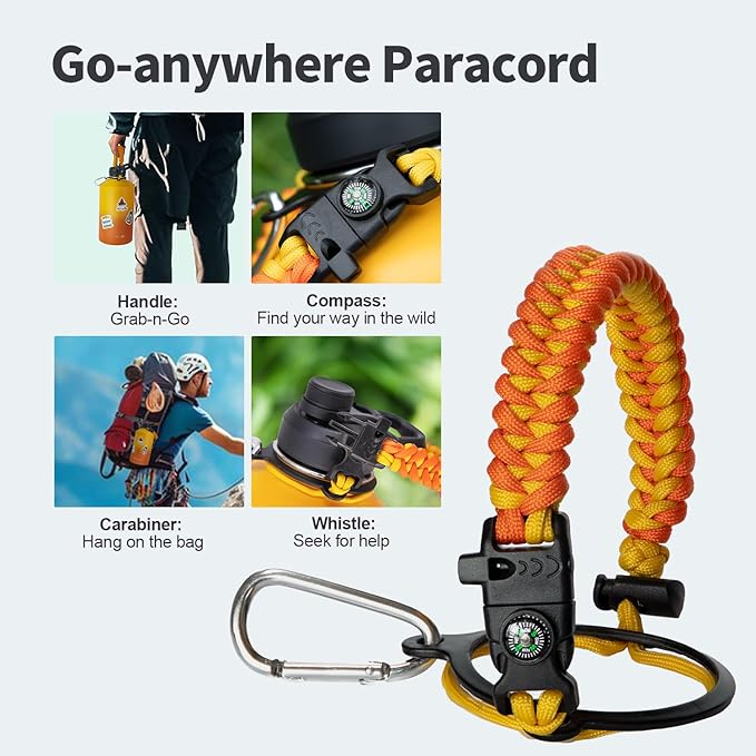 • Palm Fitting Paracord Handle: Compared to handle lids, nylon paracord on the bottle gives you more choices in terms of color coordination and coziness on your hands. Match the handle with your bottle to make a complete outdoorsy look. Compass and carabiner can be lifesavers for hiking and other expeditions