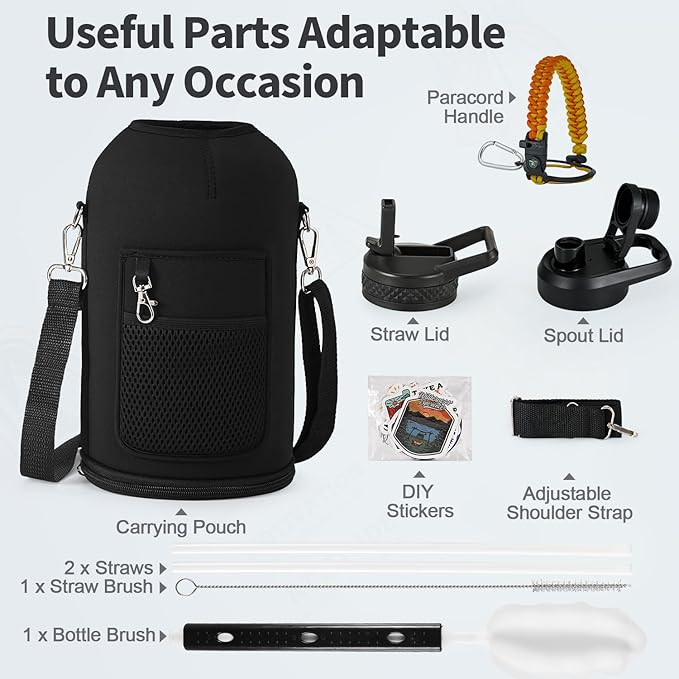 • After Services and Package: We offer continuous after-sales service against leakage and poor cold/hot-keeping capability, we are committed to 100% customer satisfaction. Your purchase includes: WixByti 128oz Water Bottle, Carrying Pouch with Adjustable Strap, Straw Lid with 2 Straws & 1 Straw Brush, Spout Lid, Paracord Handle, Water Bottle Stickers