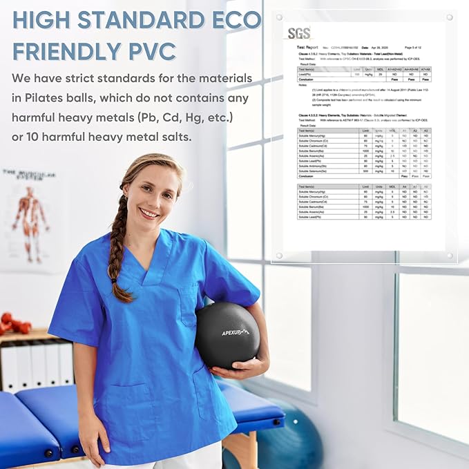 • [SAFE MATERIAL] The 9 inch workout ball is crafted from high-quality, eco-friendly PVC material, these exercise balls physical therapy meet strict standards to ensure safety and durability. They are soft, flexible, and skin-friendly, containing no harmful heavy metals such as Pb, Cd, Hg, etc., or 10 harmful heavy metal salts.