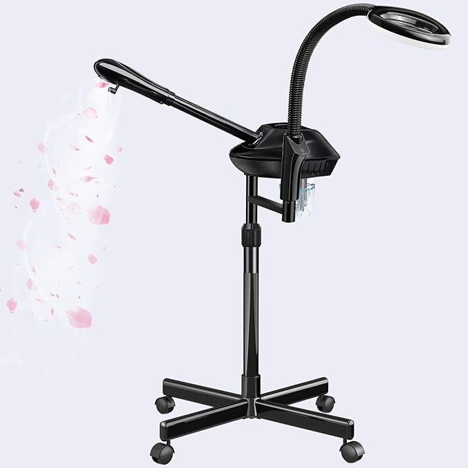• 【5X Magnifying Lamp Facial Steamer】 The 5x magnifying with adjustable light and flexible arm, designed for more convenient use, mobile facial steamer with wheels allows you to lie down or sit down to enjoy the spa aromatherapy.