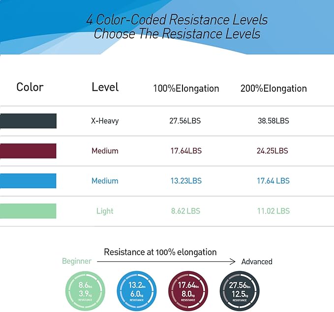 • 【Versatility and Flexibility】 Ideal for Resistance Training, Physical Therapy and Mobility Training, You Can Take a Couple Wraps Around Your Hands for More Tension and a Secure Grip. or Just Tie a Knot, For Use as a Loop Band, and also You Can Double Them Up for Even More Resistance. The Bands are Vibrantly Color-Coded, Once You are Ready for a More Challenging workout, You can Move Up to The Next Color.