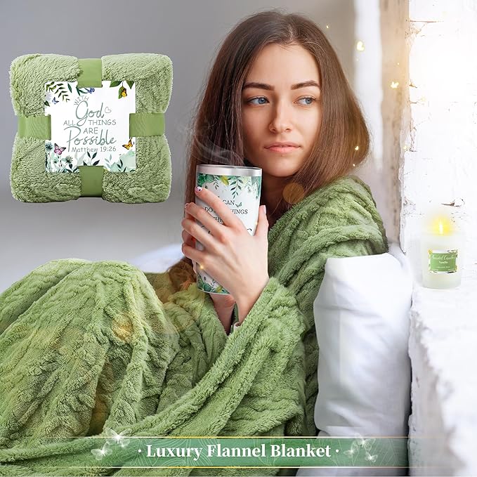 • 🥇VALUE FOR MONEY 🎁 -The christian gifts baskets come with 13 different beautiful items, 40 x60 inches Bible blanket, 7oz 50-hour scented candle, 20oz Christian tumbler with straw and brush, Bath Bomb, Butterfly Desk Decor Inspirational Engraved Keepsake, Diamond Handed Soap and Greeting Card. Each pattern is carefully designed by our designers to represent our support and blessing