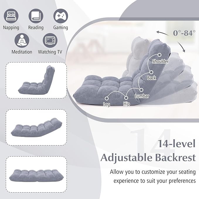 • [14 Adjustable Positions]This foldable meditation chair features 14-position adjustable backrest from 0°-84°, which allows you to easily adjust to your preferred angle for personalized comfort. Whether you're gaming, reading, working, lounging or sleeping, find your perfect position with ease.