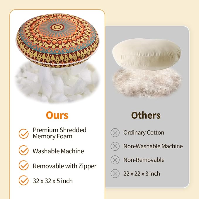• Giant Floor Pillow: LOVMOC floor cushion is 32 inches in diameter, large enough for adults to sitting with crossed legs to meditate.