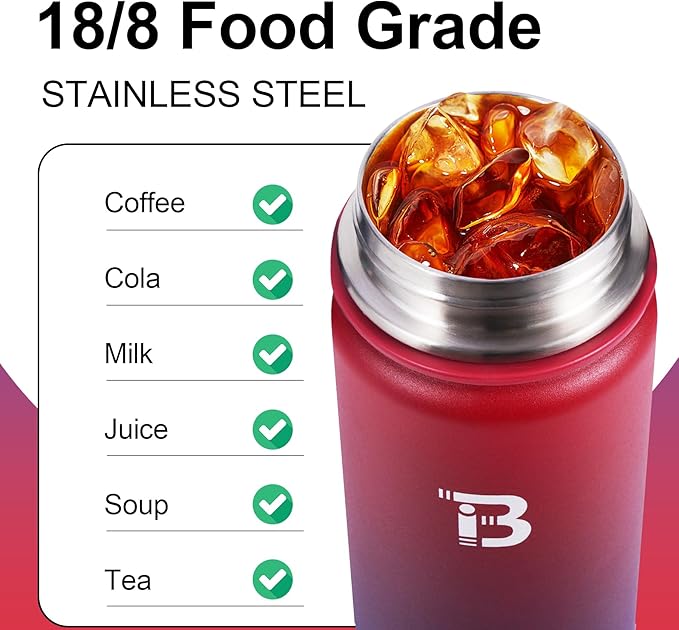 • DOUBLE WALL INSULATION: Our water bottle is made from high-quality 18/8 food-grade stainless steel, rust-proof, BPA-free, lead-free, and easy to wash. This wide mouth water bottle features double-walled vacuum insulation, which can keep your beverages cold for 24 hours and hot for 12 hours with a fresh taste. The wide mouth design is perfect for ice cubes and easy to clean.