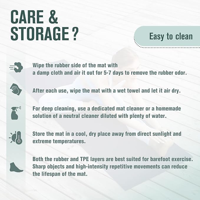 • CARE INSTRUCTION - 1. All natural rubber possesses a harmless odor of rubber. Wipe the surface of the rubber side with a damp cloth and place it in a cool, well-ventilated area for a period of 5-7 days, the odor shall gradually dissipate. 2. Clean the yoga mat by wiping the surface with a wet towel. Let it air dry naturally before storing. And store the yoga mat in a cool, dry place away from direct sunlight and extreme temperatures.