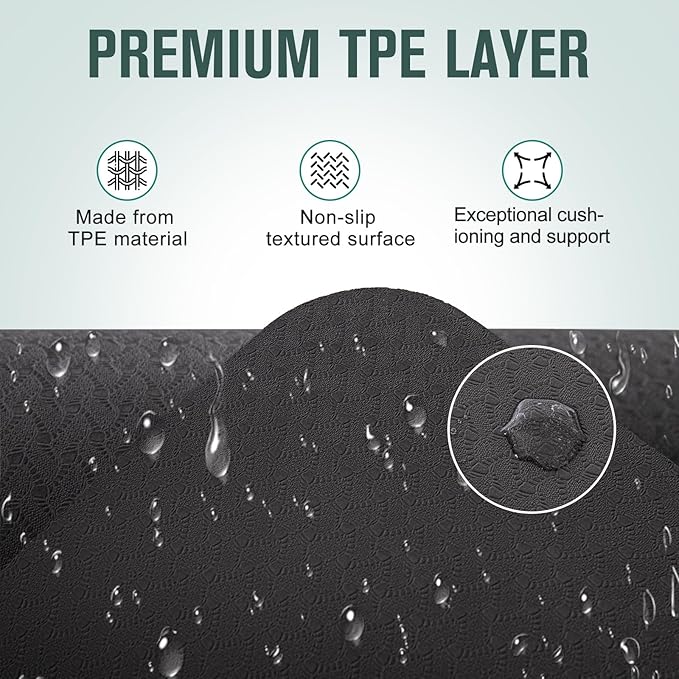 • SPECIAL PATTERN & PORTABLE DESIGN - The rubber layer features a unique pattern, resembling the mesmerizing undulations of water, adding a touch of delight and inspiration to your yoga sessions. The combination of rubber and TPE allows this extra-thick yoga mat to weigh only 2.8 kilograms, which is lighter than a full rubber yoga mat. Along with the complimentary strap, you can effortlessly carry it with you wherever you go.
