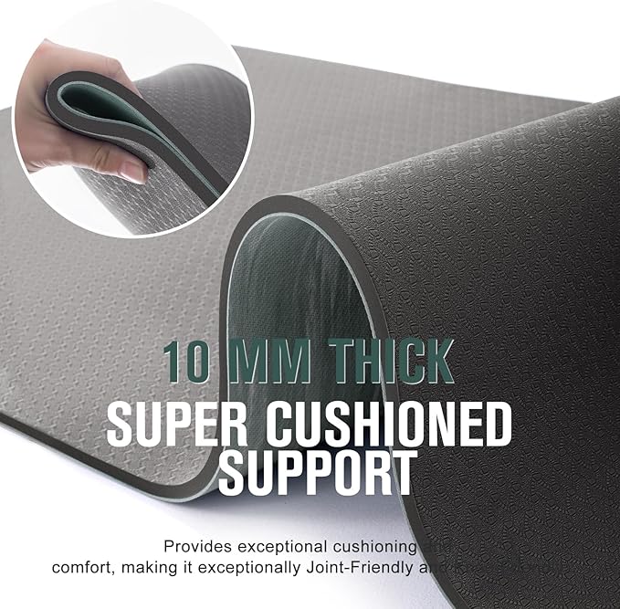 • ULTIMATE CUSHIONING - 10mm thickness offers exceptional cushioning and support, effectively preventing joint and knee discomfort caused by vibrations. When compared to normal foam mats, the rubber and TPE (Thermoplastic Elastomer) materials boast higher density and quicker resilience, allowing for better balance and stability without reducing thickness.