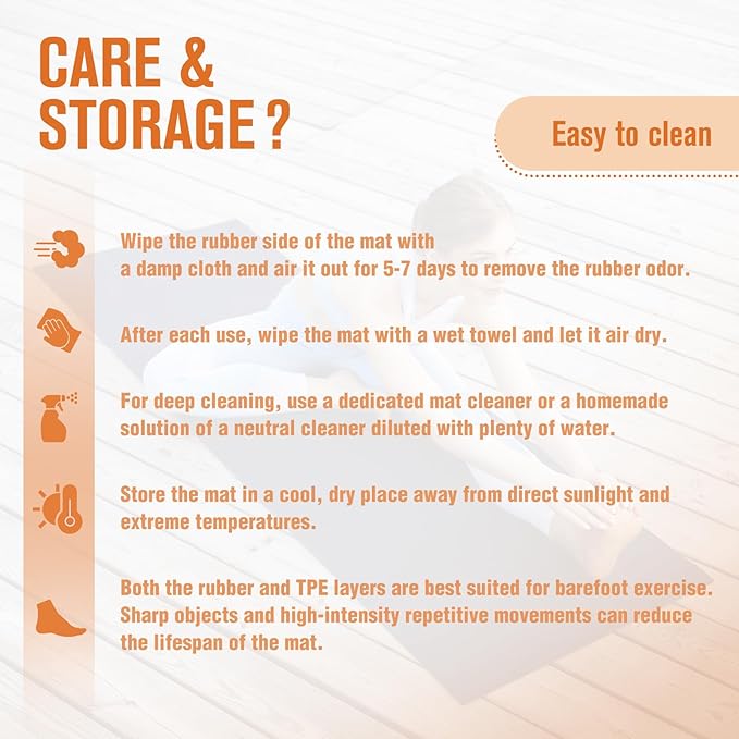 • CARE INSTRUCTION - 1. All natural rubber possesses a harmless odor of rubber. Wipe the surface of the rubber side with a damp cloth and place it in a cool, well-ventilated area for a period of 5-7 days, the odor shall gradually dissipate. 2. Clean the yoga mat by wiping the surface with a wet towel. Let it air dry naturally before storing. And store the yoga mat in a cool, dry place away from direct sunlight and extreme temperatures.