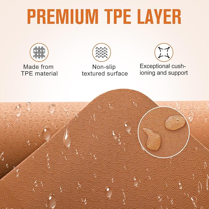 • REVERSIBLE YOGA MAT - Yoga mat features a reversible textured design, allowing for versatility as both sides can be utilized. The rubber layer is durable and tear-resistant, allowing for high-intensity workouts beyond yoga while wearing footwear. The TPE layer is more suitable for barefoot exercises due to its material properties. Hard shoe soles or high-intensity movements may cause wear and tear on the mat's surface.