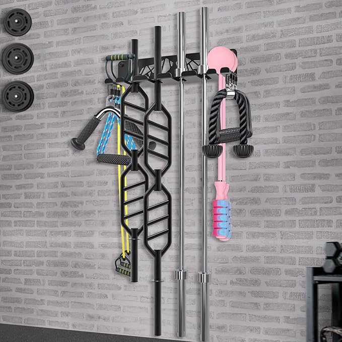 • 【Space-Saving Design】Keep your gym organized with our wall-mounted barbell storage rack. Designed to hold up to 4 barbells and additional fitness accessories, like resistance bands, jump ropes, hooks and other small gym accessories, it’s the perfect solution for decluttering your workout space.