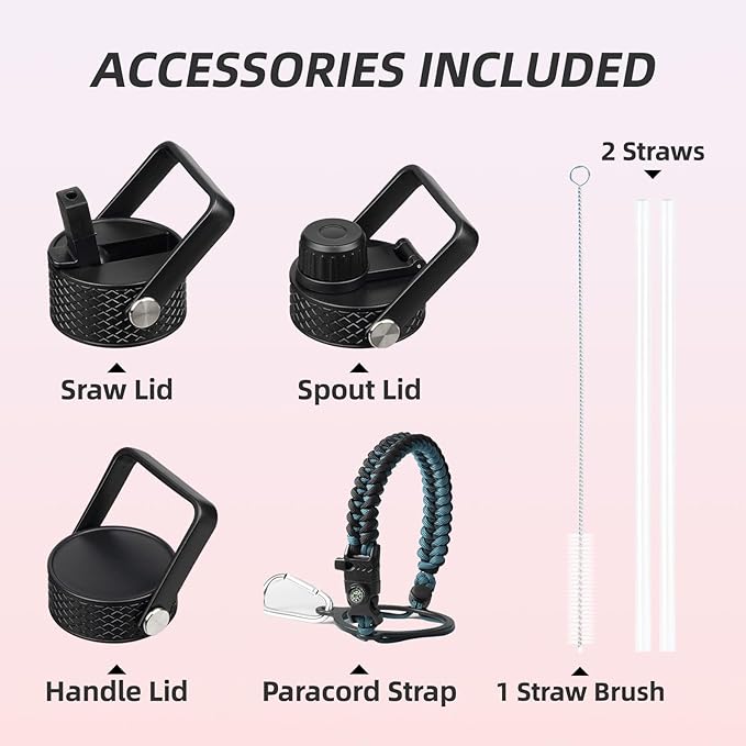 BJPKPK 1 Gallon Water Bottle with Straw Lid, 50oz, 64oz, 87oz, 128oz Large, Stainless Steel Water Bottles with 3 Lids and Paracord Handle, Double Wall Vacuum Metal Water Jug, Black