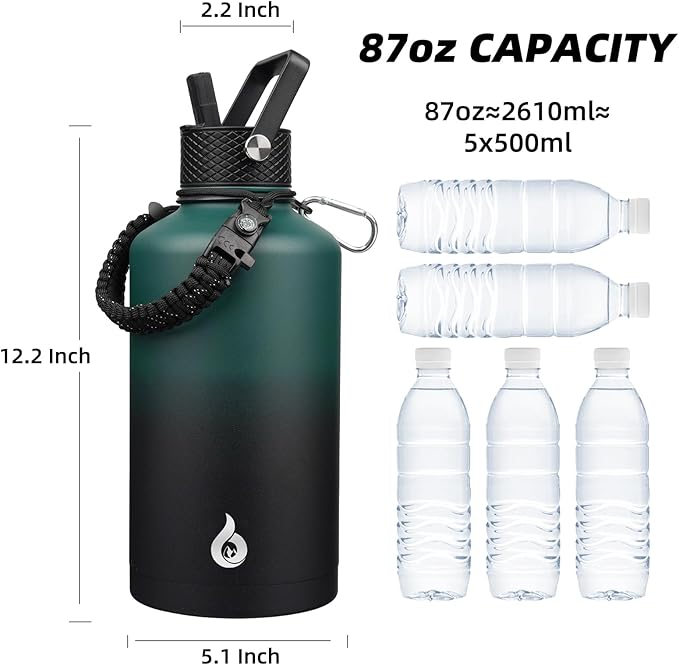 BJPKPK 2/3 Gallon Water Bottle with Straw Lid, 50oz, 64oz, 87oz, 128oz Large, Stainless Steel Water Bottles with 3 Lids and Paracord Handle, Double Wall Vacuum Metal Jug, Army Green & Black