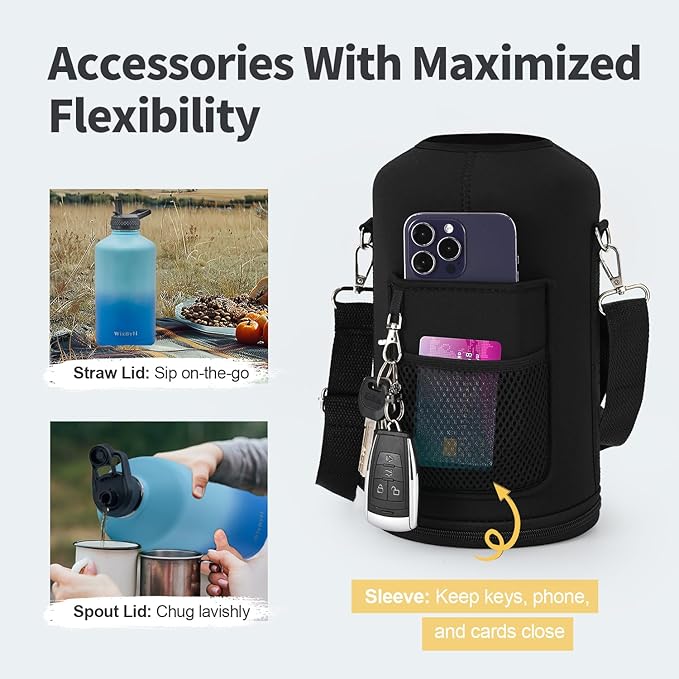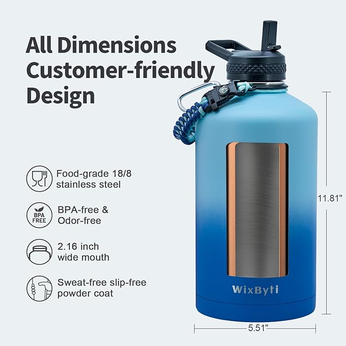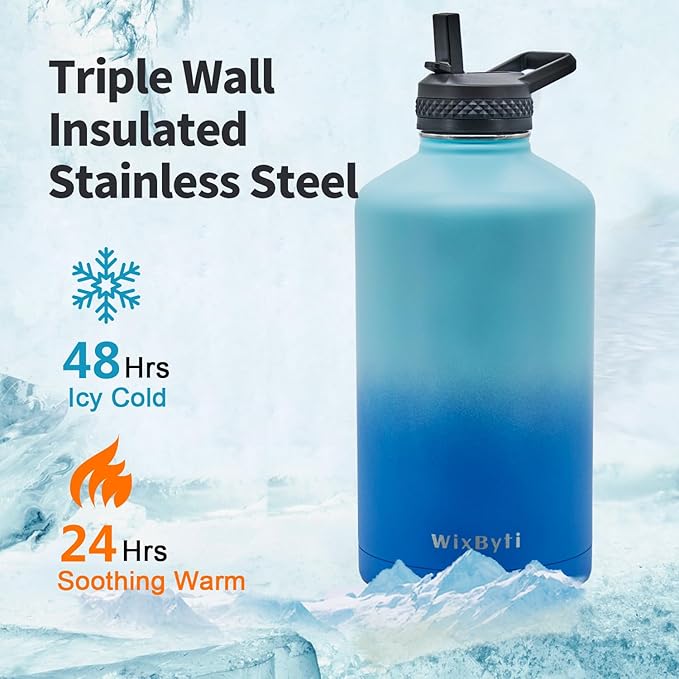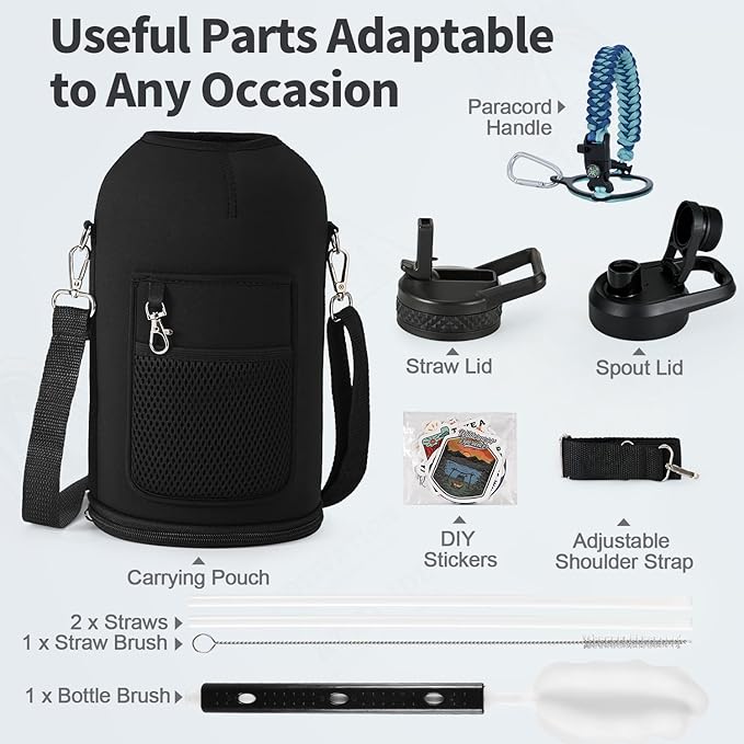 • After Services and Package: We offer continuous after-sales service against leakage and poor cold/hot-keeping capability, we are committed to 100% customer satisfaction. Your purchase includes: WixByti 128oz Water Bottle, Carrying Pouch with Adjustable Strap, Straw Lid with 2 Straws & 1 Straw Brush, Spout Lid, Paracord Handle, Water Bottle Stickers