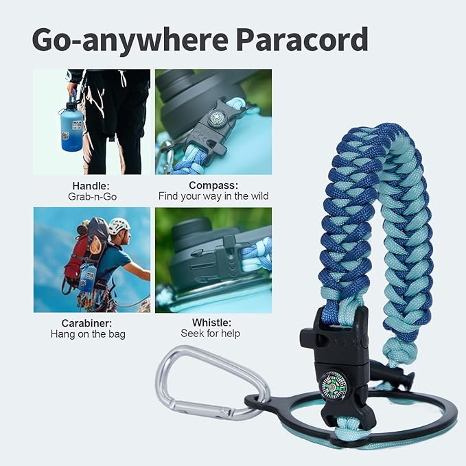 • Palm Fitting Paracord Handle: Compared to handle lids, nylon paracord on the bottle gives you more choices in terms of color coordination and coziness on your hands. Match the handle with your bottle to make a complete outdoorsy look. Compass and carabiner can be lifesavers for hiking and other expeditions
