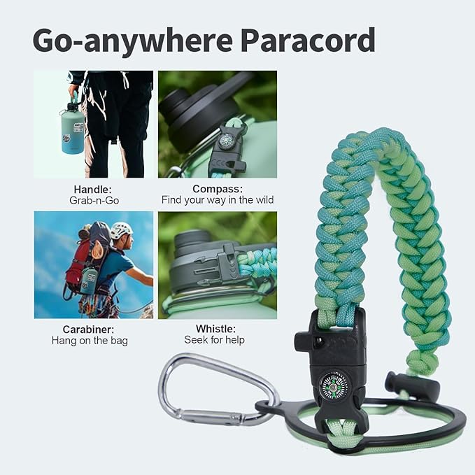 • Palm Fitting Paracord Handle: Compared to handle lids, nylon paracord on the bottle gives you more choices in terms of color coordination and coziness on your hands. Match the handle with your bottle to make a complete outdoorsy look. Compass and carabiner can be lifesavers for hiking and other expeditions