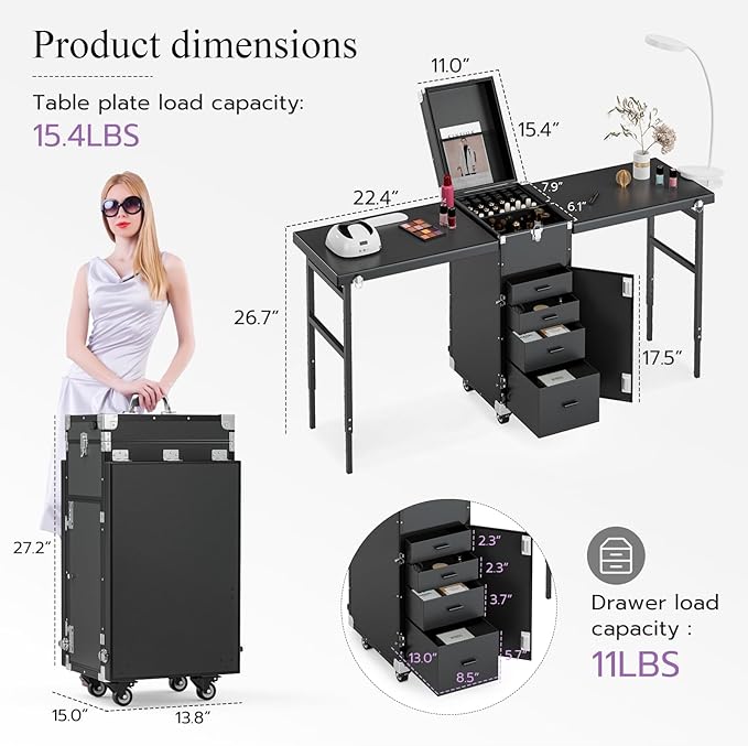 • More Spacious Desktop - The cosmetic case has 2 foldable tabletops on both sides. Provides space for 4 people to get their nails done. You can also place more items on the desktop for easy access