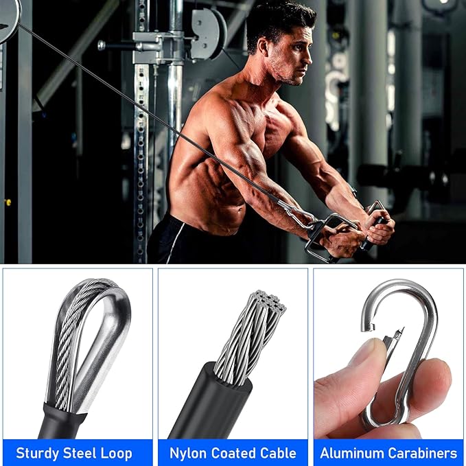 • 【Sturdy & Reliable Material】-- Our fitness extension cable for gym is made of stainless steel and PU, which is wear resistant and firm, durable and long service life. The connection between the steel wire and the PU sleeve has a nylon protective cover, ensure that the PU sleeve is firmly attached to the steel wire