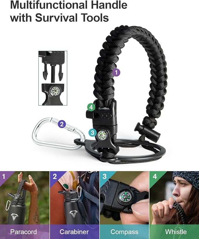 • Ready for adventures: Topre 32oz water bottles include a paracord handle,it is crafted from sturdy braided rope with an attached survival kit. This includes a compass, a whistle, and a clip, making it an ideal companion for any outdoor activity — be it camping,hiking or exploring new places through travelling.