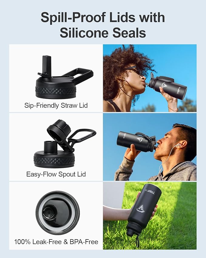 • 100% Leak-Proof: Topre 32oz stainless steel water bottles includes two lids—a straw lid and a spout lid. Both are equipped with silicone rings to prevent any spills or leaks, and are completely BPA-free for your peace of mind.