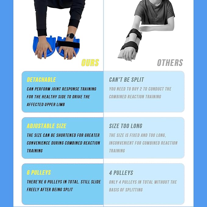 • 【Enhanced Function】This item consists of 2 symmetrical parts that can be closely joined together, with 6 pulleys that can rotate 360° and 2 Velcro straps. No matter what your muscle level is, you can carry out rehabilitation training. When disassembled, each part contains 3 wheels and 1 Velcro strap. You can put it on your hand to conduct the combined reaction practice of the healthy and affected upper limbs. This enables you to recover more easily and quickly than only exercising 1 upper limb