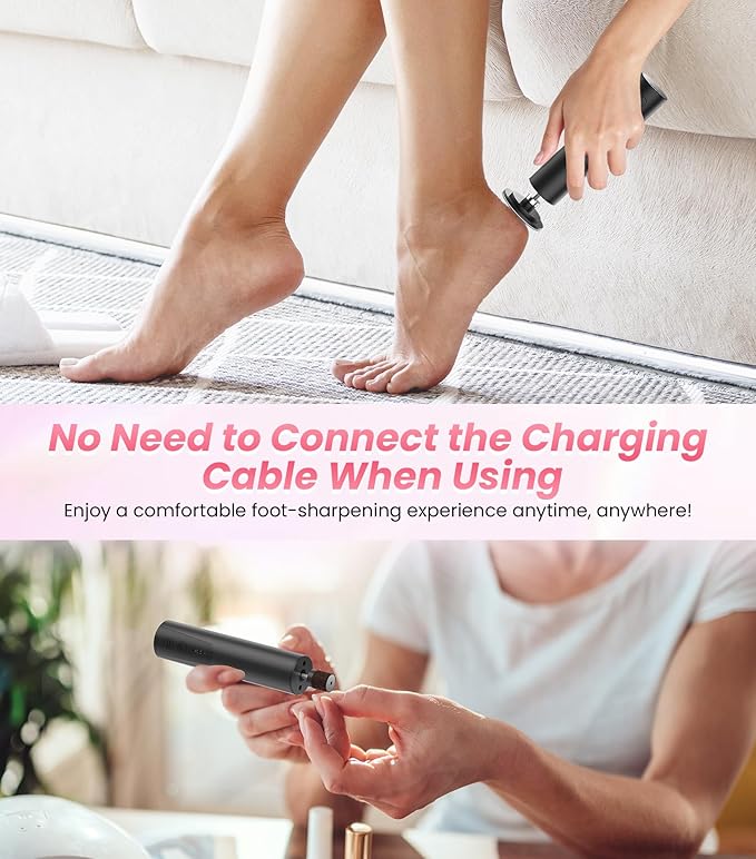 • [POWERFUL BATTERY LIFE] Our electric foot file comes with a 1200mAh battery that lasts more than 1.5 hours of working time after 4 hours of charging. This portable pedicure stone grinder doesn't need to be plugged in to use, you can experience pedicure anytime, anywhere, it's a perfect tool to remove dead skin from your feet quickly and easily.