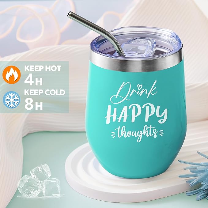 • THOUGHTFUL INSULATED VACUUM TUMBLER GIFT SET: Crafted from 18/8 food-grade stainless steel with double-walled vacuum insulation, this sweat-free 12oz insulated tumbler keeps drinks hot for 6 hours and cold for 9 hours. The motivational quote, "Drink Happy Thoughts," will brighten her day as she enjoys coffee, tea, or wine—making it an ideal relaxation gift for best friends mom sister, daughter, grandma, wife, girlfriend, coworkers teacher