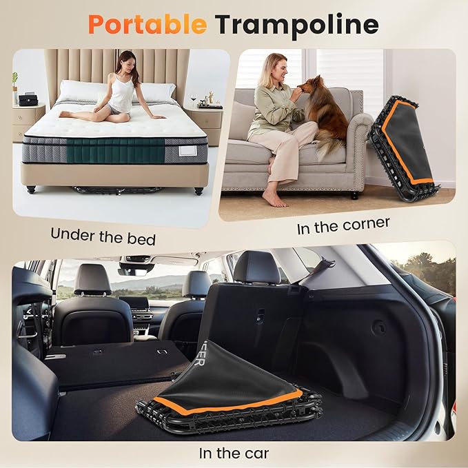 • 【Space-Saving Foldable Design】Ancheer foldable trampoline features a unique foldable design, allowing it to be reduced to less than a quarter of its full size. This makes it easy to store in tight spaces such as under the bed, behind the sofa, or even in the trunk of your car. The compact storage option means you can enjoy a full workout without worrying about space limitations. Perfect for apartments or anyone with limited storage. ⚠️Note: Need to remove handles and legs before folding.