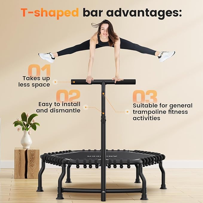 • 【 Adjustable Handlebar for Versatile Use】The Ancheer rebounder trampoline for adults with bar comes with a heavy-duty handlebar that features 3 adjustable height levels (35'' to 50''), making it suitable for people of varying heights. Whether you're doing light exercises or intensive workouts, the handlebar adds stability and control, allowing you to tailor your fitness routine with ease. This flexibility ensures the workout trampoline is ideal for a wide range of the whole fitness goals.