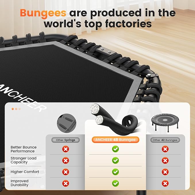 • 【High-Quality Materials & Enhanced Safety】The Ancheer indoor trampoline adults is built with a heavy-duty steel frame, ensuring long-lasting durability. The waterproof jump mat is secured with sturdy bungee cords, providing superior stability during use. With 48 high-strength bungee cords, you’ll experience smooth and supported jumps without hitting the ground. Rigorously tested for thousands of jumps, this exercise trampoline is designed to offer both safety and reliability for long-term use.