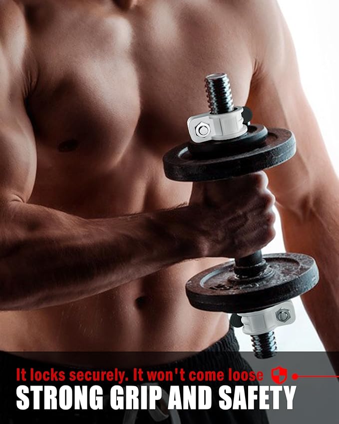 • ✔STRONG GRIP :Weight bar clips are specially designed for weightlifting and designed to provide an extra secure grip.Use these weight clips to hold your weights in place(Weight: 400+lbs)so they don't go rolling around while you're lifting. The proof of strength, even if you hold the dumbbell vertically(Weight: 60lbs), you can keep the weight! These weightlifting clips are perfect for dumbbell rows,benching, squatting etc.