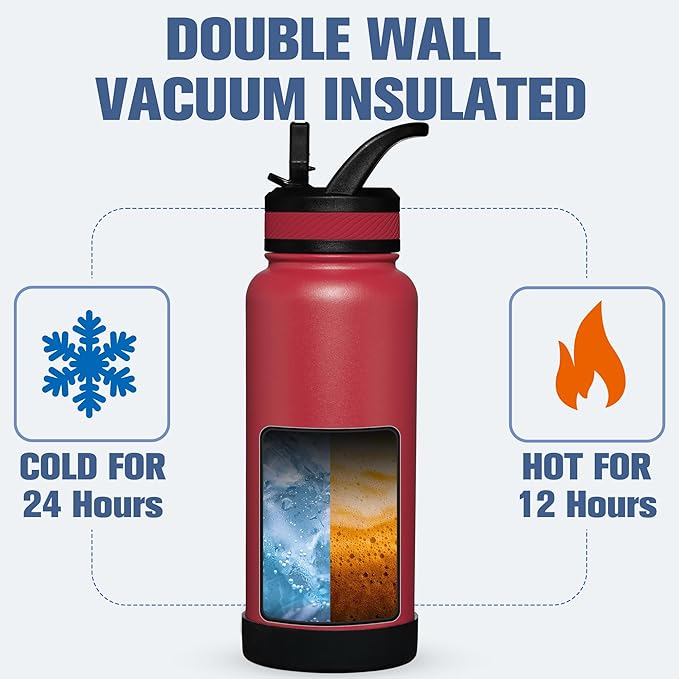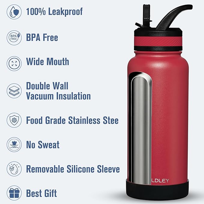 OLDLEY 32 oz Insulated Water Bottle With Straw, Stainless Steel Sports Water Cup Flask with 3 Lids(Straw, Spout and Handle Lid) Double Walled Travel Thermal Canteen Mug,Fire Red