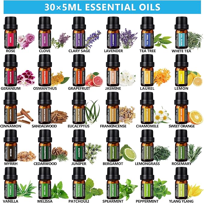 • ❤30 Essential Plant Oils❤ TOP 30 natural essential oils. The dark bottle will help keep the oils fresh and also guard against light degradation. No harsh ingredients, No additives, NO fillers. We value safety, quality in offering the high quality aroma oil products.