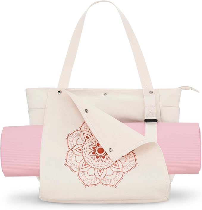 • Patent Pending. Quick & Easy Storage Design: The front of the tote yoga bag can unfold, making it easy to store your yoga mat. There's no need to worry about fitting it in, and it won't take up any space inside the tote. The use of buttons and straps allows for quick storage and ensures the yoga mat stays securely without falling out
