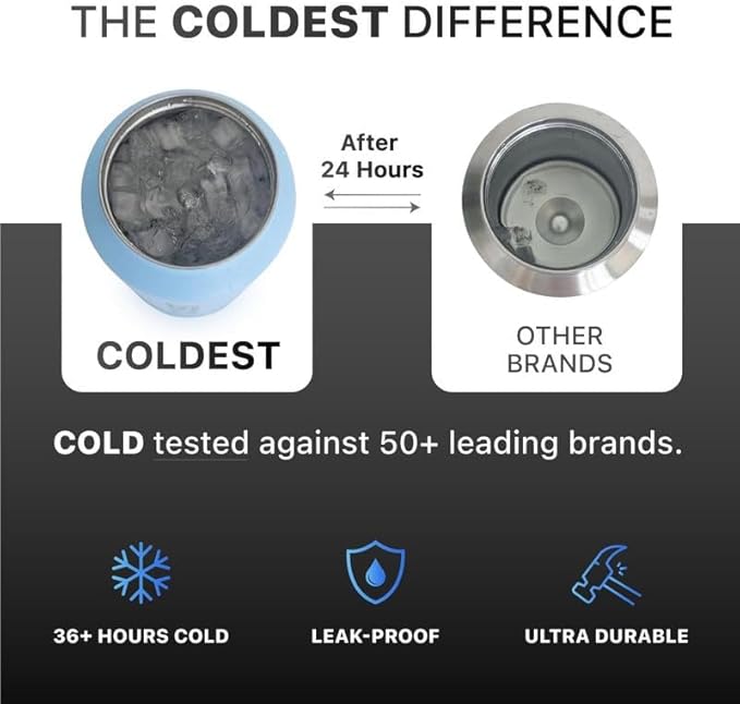 • 𝐀 𝐋𝐄𝐀𝐊-𝐏𝐑𝐎𝐎𝐅 𝐄𝐗𝐏𝐄𝐑𝐈𝐄𝐍𝐂𝐄: Is your water bottle flask creating a wet mess? The Coldest 18/8 Stainless Steel Water Bottle boasts a 100% leak-proof design, ensuring not a drop escapes. Thanks to the wide mouth lid, it provides convenience without compromising on leakage protection. The true double-wall stainless steel construction guarantees a water tight seal, allowing you to confidently embrace a mess-free hydration experience with Coldest Steel Water Bottles.